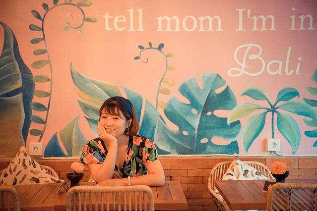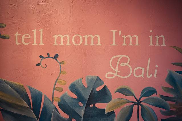 乍一看这个小餐馆还挺普通的,要坐下来才会发现里面处处充满小而美的细节。临街的餐位有街头的市井味儿,最里面的位置则面对一片绿意盎然的田园风光。最瞩目也是最适合拍照的是店里有一面粉红色的“网红墙”,上面画着各种绿色的热带植物,并用大大的字母写着:tell mom I’m in bali,你说应景不应景?