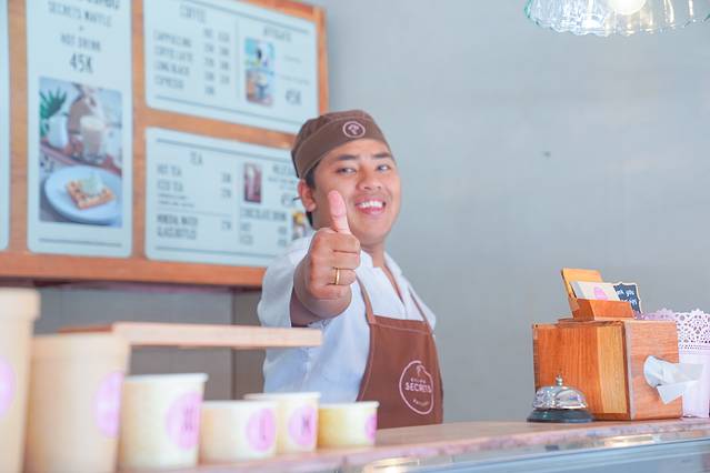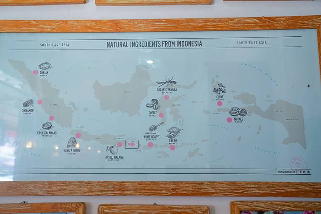 刚好我们点完餐,上一波客人刚离开,于是店员小哥就得闲和我们聊了一会儿。据他介绍,Gelato Secrets这个品牌创办于2009年,所有的冰淇淋使用的都是 巴厘岛 和印尼100%天然的新鲜食材,纯手工制做,不含人工调味料、色素和防腐剂,也不含鸡蛋。口味上既有 意大利 经典原味,也有来自当地时令水果和香料的印尼风味。他给我们指了指墙上,上面有一张印尼的地图,标记着店内使用食材的产地。像巧克力和香草都来自 巴厘岛 的不同村落,榴莲则来自苏门答腊岛的 棉兰 小村。所以想吃到地道的印尼风格的Gelato,来这家小店就对了呢。