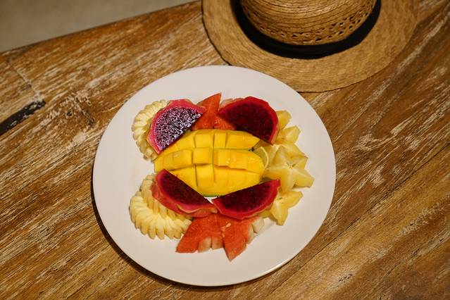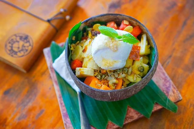我们点的椰子冰淇淋综合 沙拉 装饰在一个大号的椰子壳里,颜值特别高。最上面是纯白的椰子冰淇淋球,点缀着新鲜的薄荷叶和焦糖碎。冰淇淋下面是香蕉、西瓜、木瓜等时令水果,以及看起来很健康的谷物和坚果。饮品是鲜榨芒果汁,上面有一层椰子冰淇淋,融合起来既有芒果的甜糯,又有椰子的清香,口感一级赞。