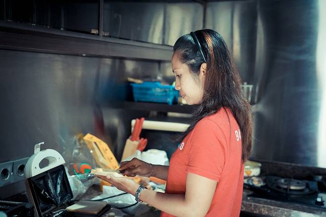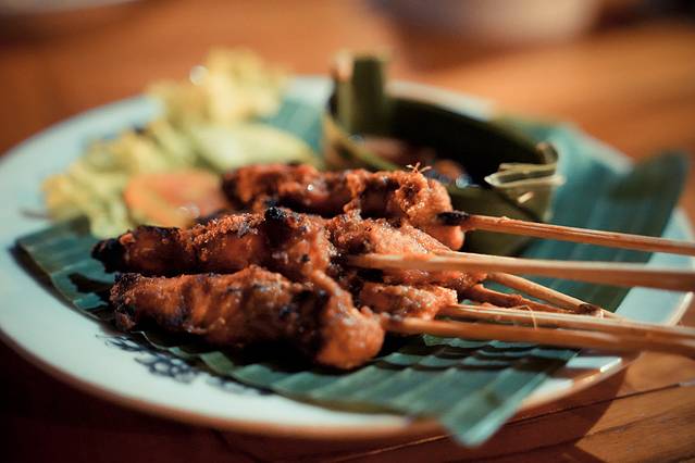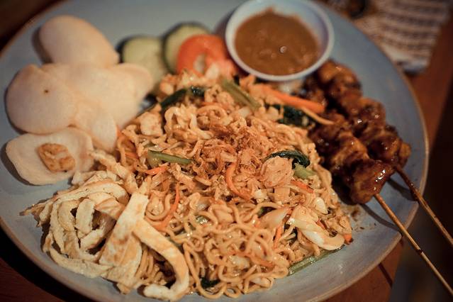 有了之前两次来 巴厘岛 的经验,我对这里的炒面与混合果汁情有独钟,看到菜单上有就毫不犹豫地点了。另一份主食点的是印尼招牌的什锦拼盘饭,进门时看到烧烤架上现烤的沙嗲烤串,诱人的香气也让我们点了几串鸡肉串。厨师清一色的都是女性,在开放式的厨房娴熟地翻炒着菜肴。当我们好奇地在旁边参观时,她们 大方 的露出热情的笑容。