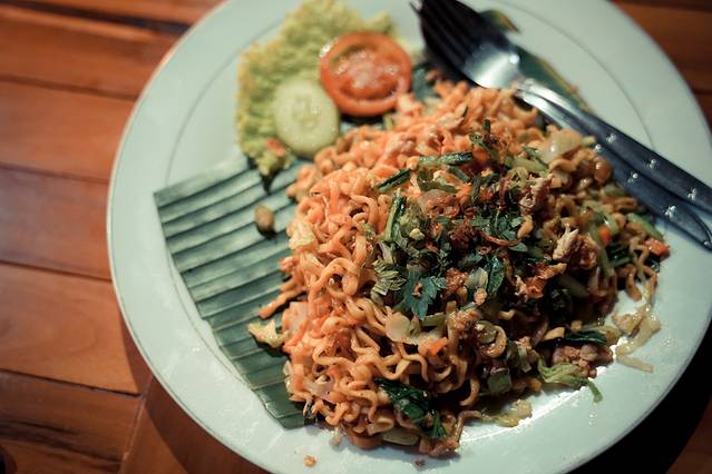 在 巴厘岛 吃到的炒面的面条都很像方便面的形状,这里也不例外。裹着浓郁香料的面条缠绵在香蕉叶上,看着就让人胃口大开。也不知道她们都用了哪些调味料,看着普通的炒面居然如此香辣可口。