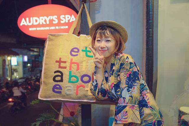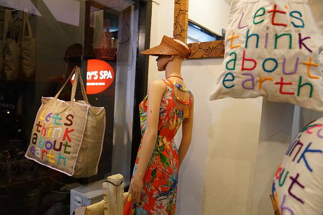 今晚是在 巴厘岛 的最后一个晚上了,从clear café出来,我们恋恋不舍地在乌布街头转了又转。这几天,十字路口附近这几条街被我们转了个遍,有时候某个转角的小路反而藏着许多很有个性的小店。 比如 这家RENFUA ECO BAG,最初就是门口的一个超大的环保购物袋吸引了我们的目光,上面用彩色的刺绣写着Let’s think about the earth。