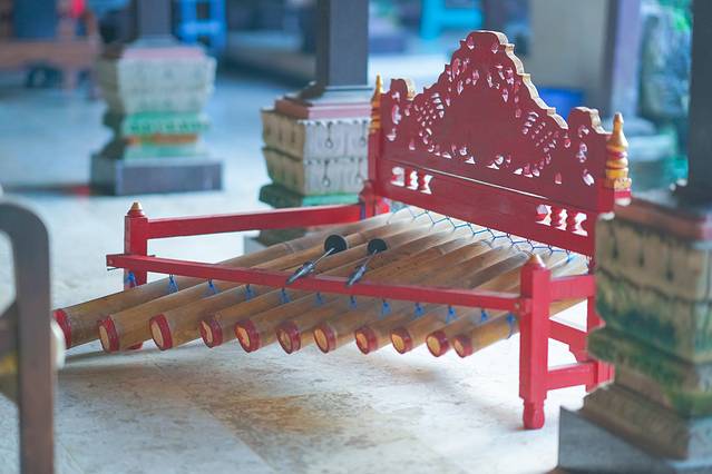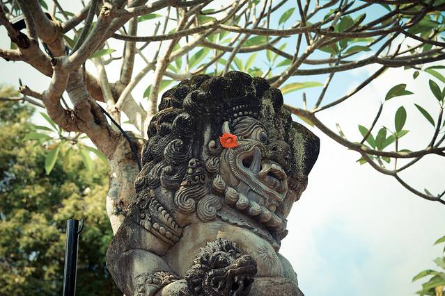 在老板娘一家居住的前院里,可以近距离感受到 巴厘岛 人一天的生活是多么悠然自得。围廊四周挂着一圈鸟笼,里面养着许多叫不上名字的鸟,看来清晨的鸟鸣声就是来自它们。 巴厘岛 人热爱音乐,所以可以看到一架竹子制的传统乐器贾麦兰摆在走廊里,让人忍不住想去尝试着演奏一下。在一个小型的舞台上,上面摆放着毛绒绒的带着面具的巴龙,老板娘告诉我们这是传说中代表善良的神兽。