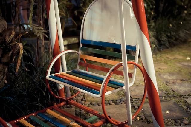 走进来才发现,原来里面竟然藏着一个别有洞天的美丽花园呀。餐位主要分布在几座敞开式的 巴厘岛风格的木屋里,有的位置还是需要拖鞋入内,盘腿而坐的,看起来十分慵懒闲适。石板路铺就的院子里生长着各种热带植物,温馨的吊灯悬挂在几棵高大浓密的鸡蛋花树下,微风拂过,遗落满地花朵。院子里还有一部彩虹色的双人秋千式座椅,相比有小朋友来这里也会玩得很开心。