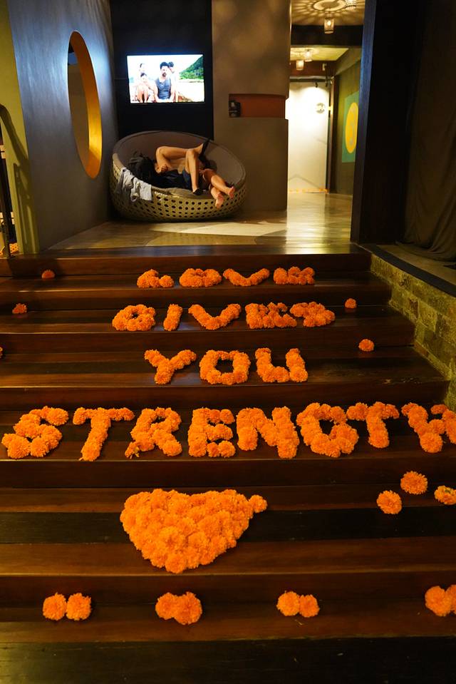 二楼的座位相比之下更适合小聚,窗口的位置面朝街道,十分惬意。二楼还有一个Clear Spa,通往spa的阶梯上用花朵摆放出“Love Gives You Strength”的字样。爱给你力量。看来这边的Spa都有自己的能量场呢。