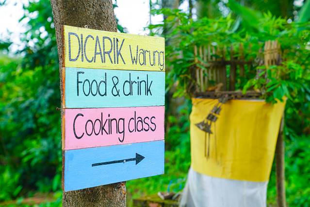 沿着稻田里的小路,不知不觉我们走到了一间餐厅前。树上的彩色的指示牌和小木屋上的复古广告牌让我们对它很有好感,刚好肚子也饿了,今天的午餐就这里了。