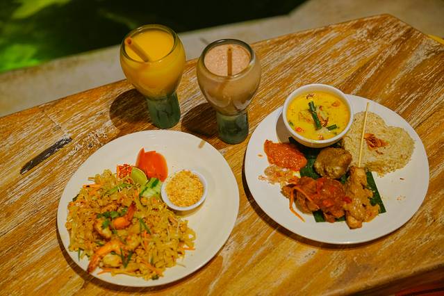 泰式炒河粉是猫途鹰上的推荐菜,可以用名不虚传来形容,海鲜配菜充足,手工制做的辣椒酱也很给力。杂菜饭(nasi campur)是印尼传统菜,在一些餐厅和小摊,你是可以选择自己想要的配菜,然后店员会给把配菜和米饭一起盛在盘子里。Clear则是直接配好了端上来,配菜可以选海鲜或素食。海鲜款里有沙嗲金枪鱼配花生酱,炸虾炸金枪鱼配甜辣酱,土豆饼和 巴厘岛 特制咖喱汤,蒸米饭还做成了心形,超有爱。