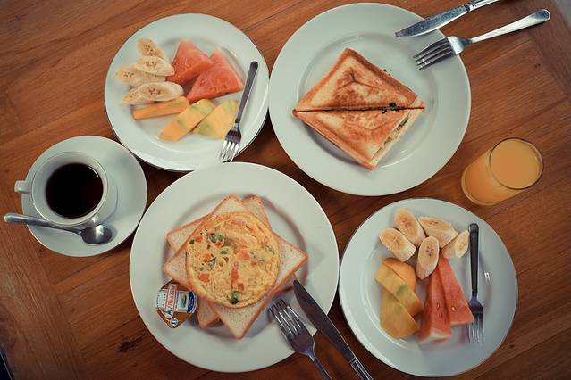 早餐是含在房费里的,有六种不同的选择。其中,烤过的 三明 治里包着洋葱丁、番茄丁和鸡蛋,味道算是里面最好的。喜欢甜食的朋友点了香蕉煎饼,洒满了椰丝和蜂蜜,也是别有一番风味的。每人有一份饮品,可以选咖啡、果汁或茶。除了主食,每个人的套餐里还包含一盘新鲜的水果拼盘,作为早餐还是很健康的~