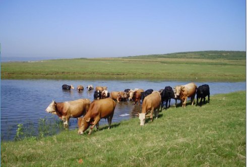 刚下马就听见有人喊:“牛群下水了”!寻声望去,果然一群牛正游过来,急忙举相机抓镜头,牛一步步走近我来,开始我只顾照相,只有几步远的时候我害怕了,因为我的衣服是红色的,赶紧走开了。饶过牛群展望水库,水波荡漾、波光粼粼、游船悠哉、,遥现湖心岛,黑色的燕子低飞在绿色的水面上,时而白鹭展翅,蓝天、碧水、绿草,感觉像到了异域草原!