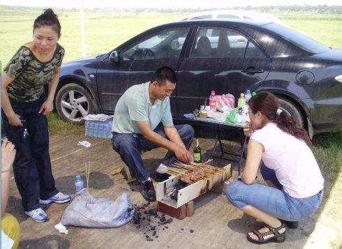 眼福要饱,口福也要饱,看看烧烤怎样了?肉基本切完,大伙在穿串,炉上已经开始烧烤,说实在的老妖很尽力,但必定是个新手,烤的不快味道还不错,老妖头上太阳脚下烤炉,汗流不止,直到峰峰的人马回合,有位行家才替换了他,这位行家人称“常总”,他手法娴熟,首先养火,然后铺开,这样就烤的快了,加料也很专业,随便的在酒精瓶和水瓶子上扎个眼就大大改进了工艺流程。
