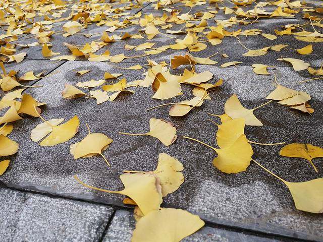 哦,我见着这样的叶子都说是枫叶,究竟是什么叶子咧?这是黄色的,黄色的,这会子,环卫还没扫到这里,地上铺上一层金黄,漂亮~~