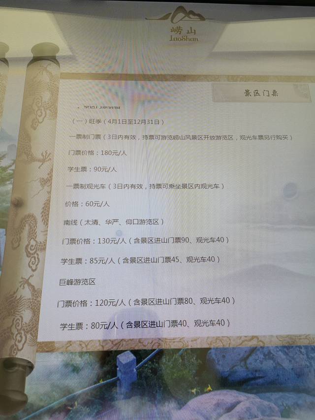 一票制门票(3日内有效,持票可游览崂山风景区开放游览区,观光车票另行购买)