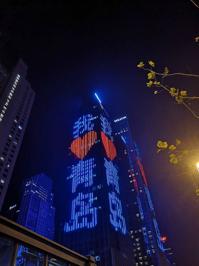 这是在五四广场附近拍摄的一张照片,仅此一张,这照片的珍贵度,我和小伙伴是深有体会,刚拍下来,我对小伙伴说,“你站过去,我给你拍张吧。”正调整角度,躲避行人,大厦灯光暗了,是的,暗了,看了下手机, 8点了,只是8点,原先周围亮起来的大厦也暗了。