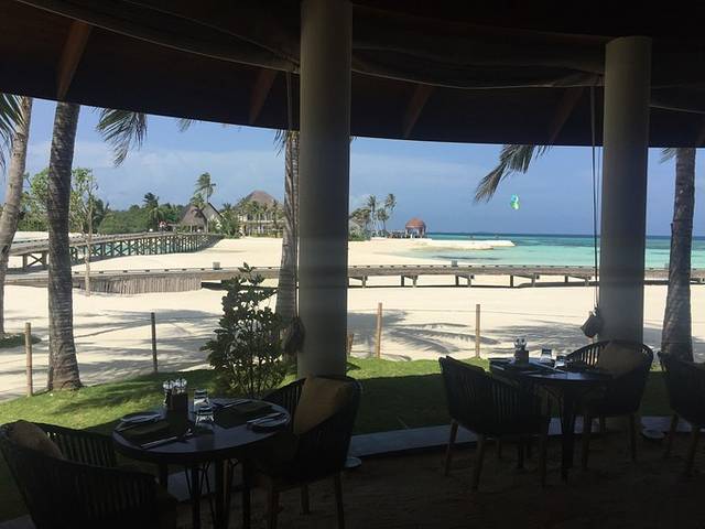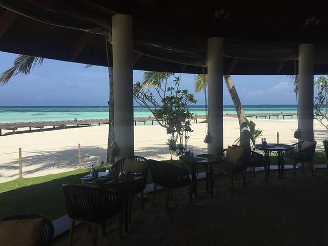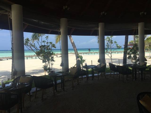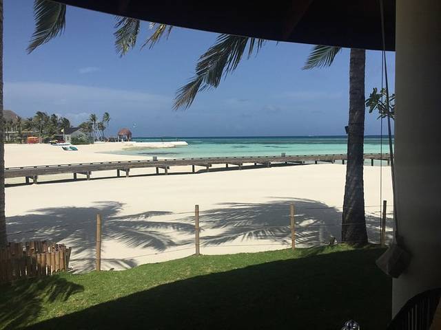 经过45分钟的颠簸,天空的乌云也渐渐褪去,好像一切都预示着事情在往好的方向发展。上岛后的欢迎饮料和香槟,抚平人的燥热,但我还是有些许不安的,关键其他人都是干净清爽闪亮登岛,而我们一家三口狼狈不堪,哎,前面的一切都是我不想再经历的,如果有时光机我一定要回到行李上岸后……管家接待了我们,与我们核对了我们之前与酒店邮件沟通预订的 北京 餐厅、 印度 餐厅、水下餐厅、SPA的时间(是的这些项目亲们可以直接与酒店预订),另外贴心的帮我们预订了出海海钓、日落巡航海豚之旅,带我们到岛上各处参观告知地点等,然后要我们去酒吧先休息一下,等房间清理好后就可以去房间。