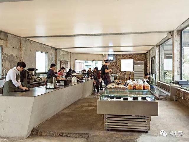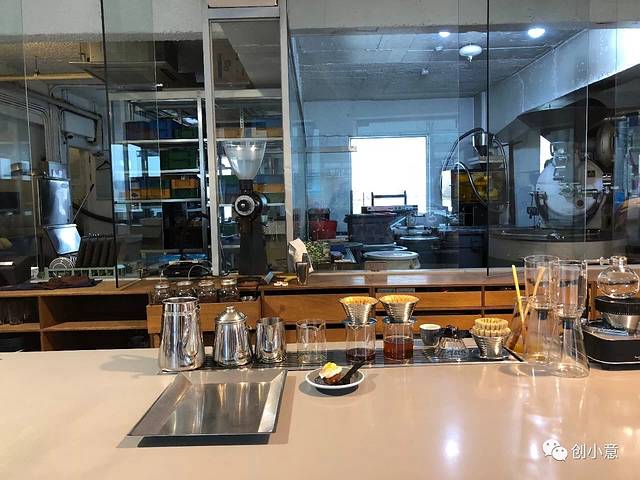 在前台点单时可以看到玻璃后面大型的咖啡豆烘培机,以及放满物品的货架,吧台上有一排手冲滴滤器具,整个制作过程可以说是很透明的,咖啡师们能在吧台上不紧不慢的冲泡咖啡,业务能力是无容置疑的了。