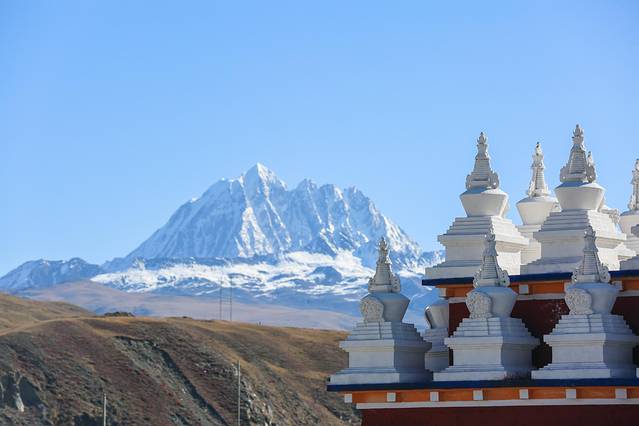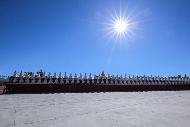 路过塔公寺,并没有停留,在塔公寺的外围有一排长长的转经筒,上次来的时候也没有去寺庙,就只转了一下转经筒。这一次我们直接来到了塔公草原的停车场,远处的雪山,近处的白塔相得益彰,无比圣洁。
