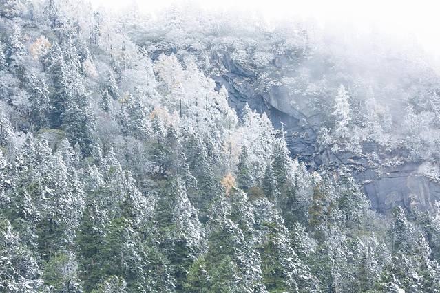山下云雾缭绕,山上白雪皑皑,秋景雪景相融浪漫极了。