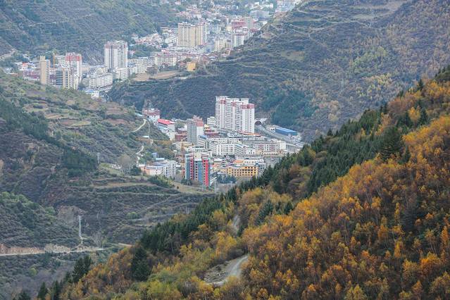 城市的另一边,整个城市是一个狭长形的,因为海拔不高,所以在马尔康待的时候还是比较舒服的。我们走的这座山树木茂盛,一到秋季,整条路都是在彩林中行走。而眺望对面的山坡,光秃秃的,形成了鲜明的对比。