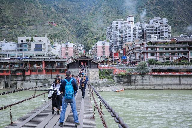 即使如今已经在铁索上搭了木板,但走到上面依然能感觉到河水湍急,让人心惊胆战。我大概走了十米就折回来了,走在平地上的时候腿依然觉得很晃。
