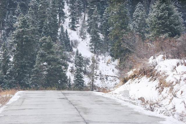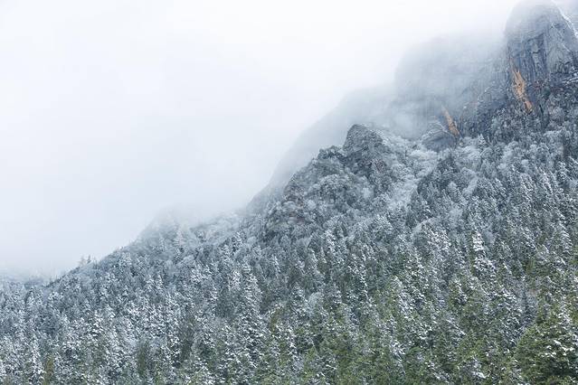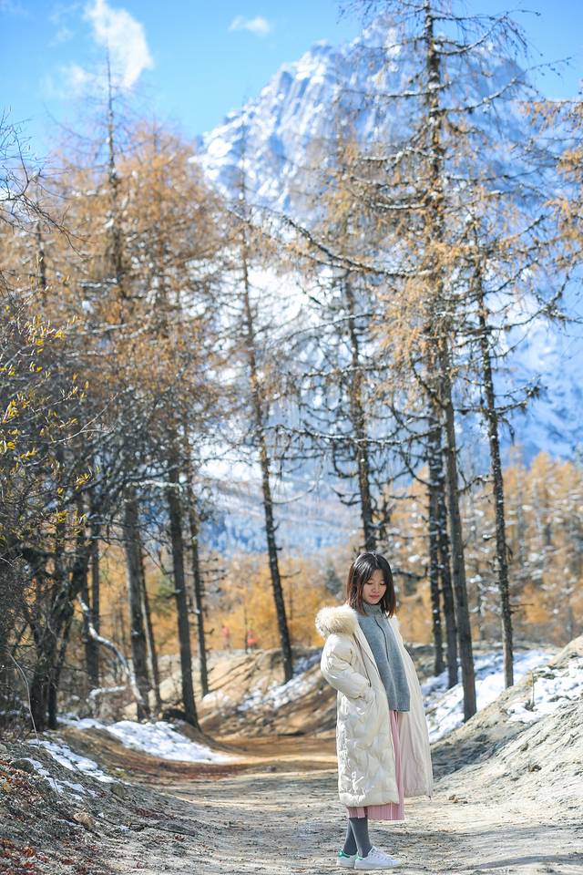 越往上走,彩林就在身后消失了,道路两旁的雪越来越多,前方的树枝上还挂着雪花,仿佛一棵棵圣诞树。我住的城市很少下雪,每次见到雪都是很激动的。