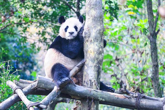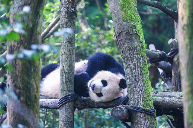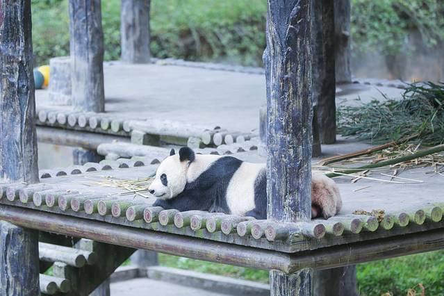 进入熊猫园的第一个点就有几只大熊猫,每一只都有一个木房子,俗称熊猫别墅。但这几只萌宠的状态就是除了睡就是睡,睡姿也是千奇百怪的,即使这样,依然觉得萌翻了。