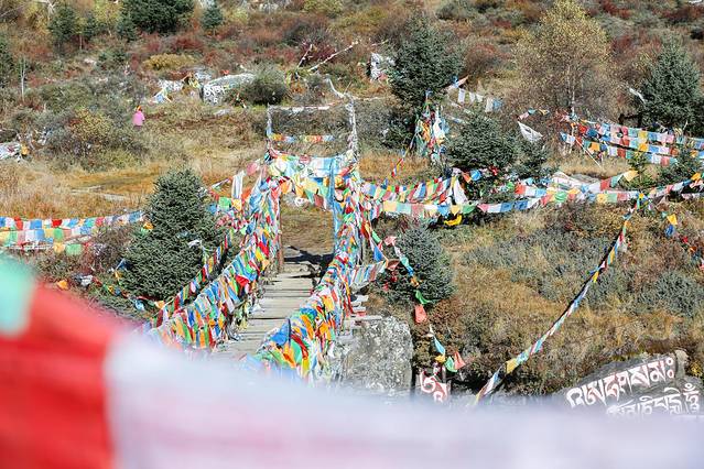 一座木桥连接着两岸,经幡挂满了木桥两边,在这一片全是石头的地方增加了一道色彩。