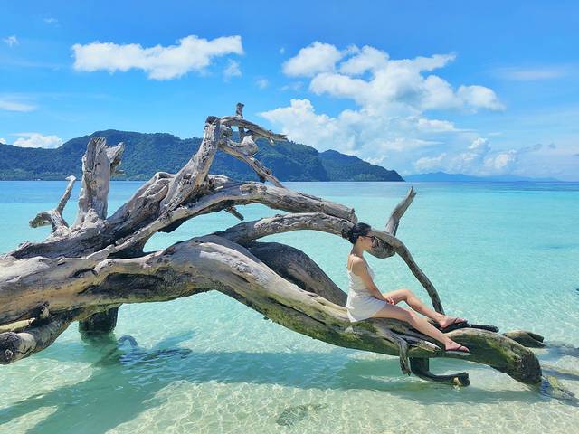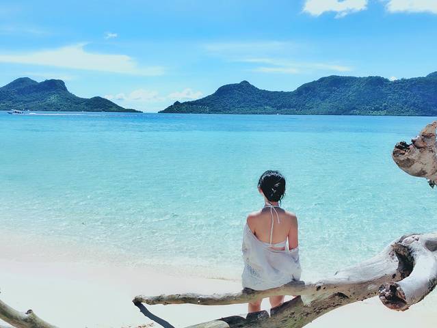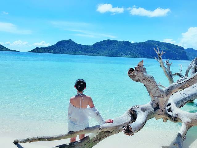 沙滩上的一颗枯枝,却成了女生们的最佳拍照点,坐在枯枝上看着渐变色的海水很少陶醉。