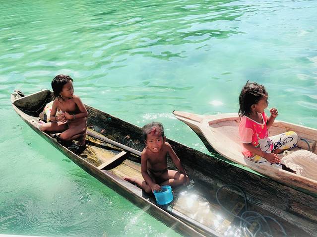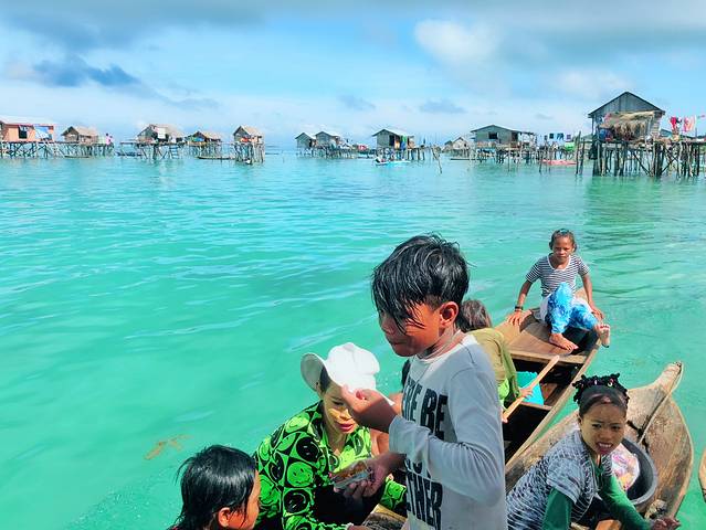 而这里,也正是我们在仙本那的第一站——探访海上巴瑶族。当我们的船只离他们还有一段距离,就已经能看见这群孩子迅速划船过来,似乎知道我们要给他们带来好吃好玩的。