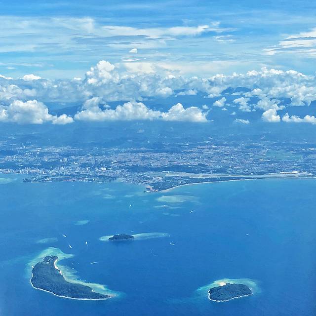 历经四小时,红眼航班到达亚庇上空,把手贴近窗户,瞬间感触到一股热带气息,要知道在红眼航班上度过超强冷气的三个小时真心不容易。从窗户望去,映入眼帘的除了海天一色蓝之外,还有万蓝丛中那些绿。