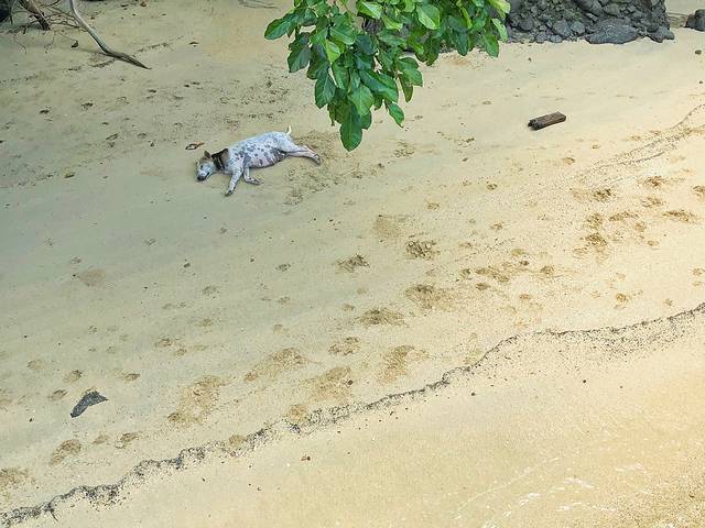 码头旁的沙滩上,小白狗甚是悠闲午睡着。