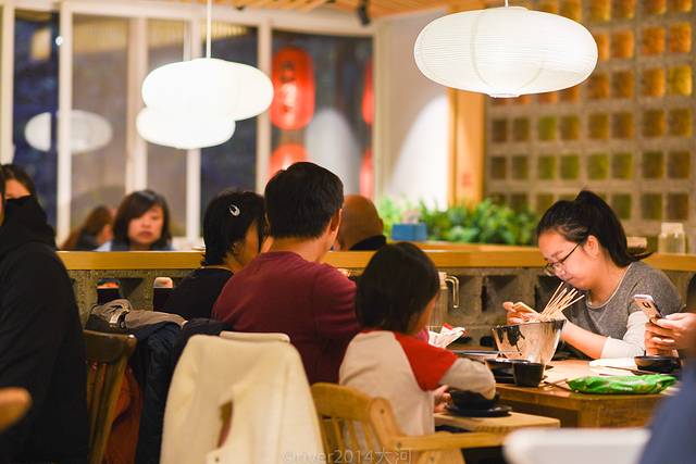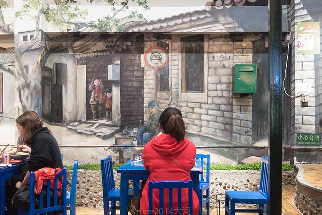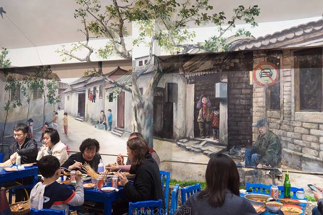 四周墙上都是几十年前的城市样貌,桌椅比较低矮,客人坐在蓝色的木质椅子上,虽然价格不贵,但深受欢迎,甚至连情侣约会到来这里吃。