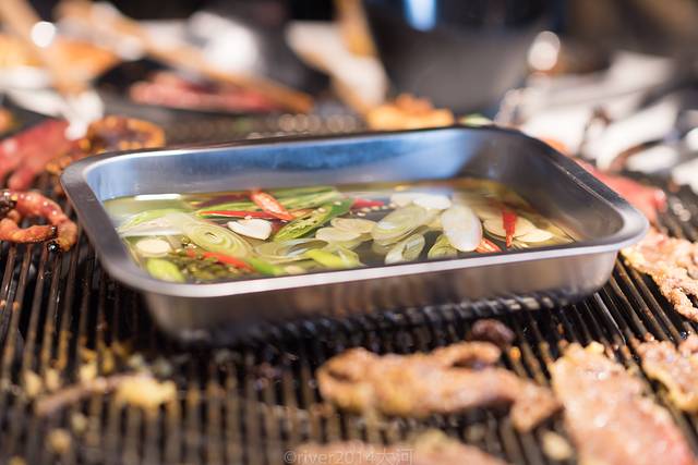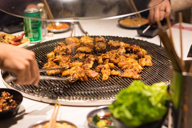 当然还有更特色的吃法,就是油涮了,这可能是结合四川人爱吃火锅特意开发的吃法。把装着油和调味料的盘子放在烤盘上,把油烤至沸腾,然后就可以用来涮各种肉了,最常见的是毛肚、黄喉、腰花、牛肉等,跟吃火锅的食材差不多。