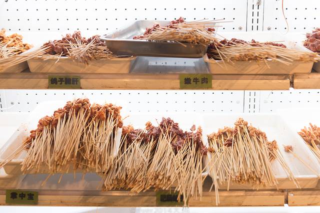 自己到柜台选择喜欢吃的菜,各种肉类都被竹签穿了起来,有的穿一根竹签,有的则穿两个竹签,说明价格不同,最后结账的时候根据竹签数量来结算,五毛钱一根竹签。