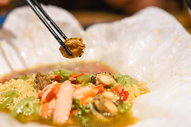 纸上焗鲜鲍也是最受欢迎的菜品之一,上菜的过程就充满了艺术性,整道菜被一张纸严密的包裹起来,让客人好奇,等纸打开以后,菜品方才显现出来,一个一个的小鲍鱼就是这道菜的精华。