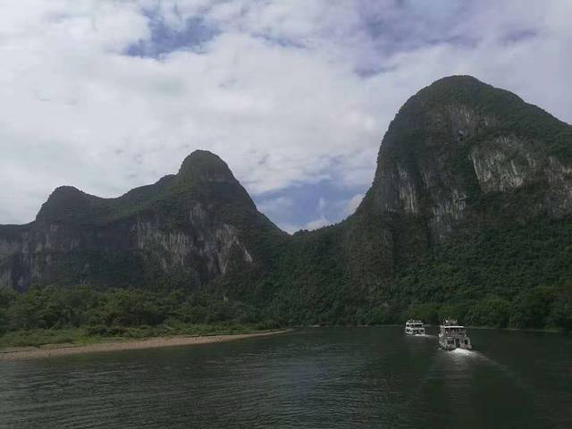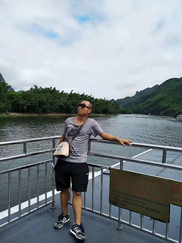 一路的风景其实差不多,都是一样的山,一样的水,说实话水有轻微的污染,时不时还能看到垃圾和水葫芦,一路有专门的打捞师傅在清理垃圾。从磨盘山到阳朔大概需要4.5小时的时间,要看当天的水位,中午在船上吃的是套餐,典型的广西口味,偏甜,作为四川妹子还真是有点不习惯呀,全程我们几乎都是在3楼的露天观景台上度过的,因为夏天的那种风吹着很舒服,加上那么漂亮的风景,真的很醉人,一路不会孤单,前后都跟着游船,有时候大家还互相打招呼,虽然也不认识,还是很好玩的,一路导游会介绍一些著名景点,不同的石头从不同的角度看就是不同的形状,反正我是没有看出来的。漓江的两岸时不时还有当地人在放羊或者放牛,那种感觉真的很惬意。