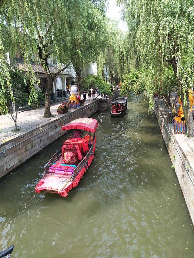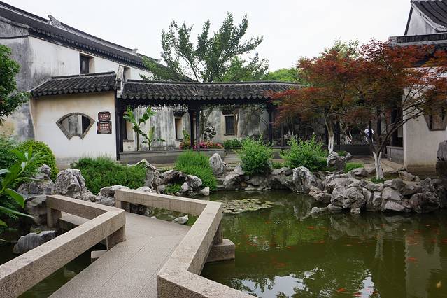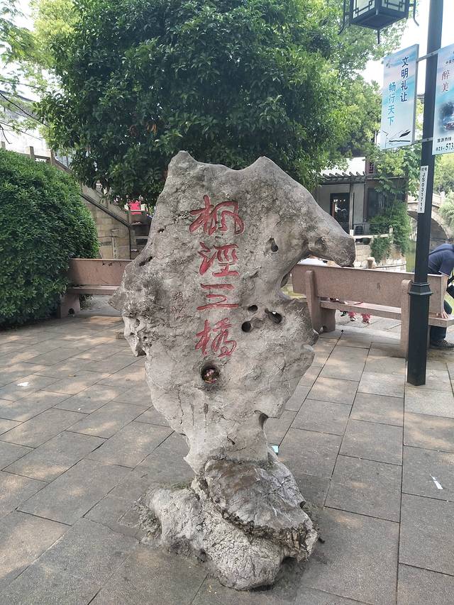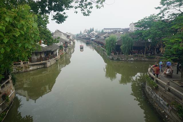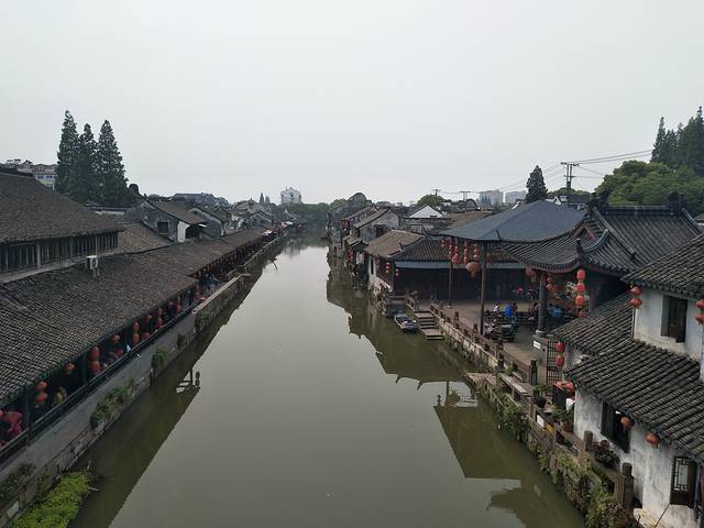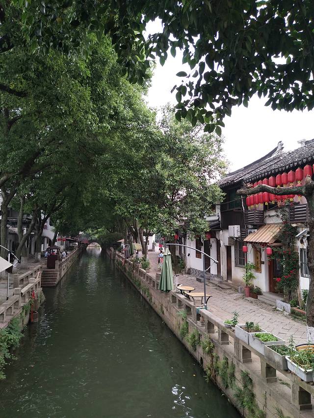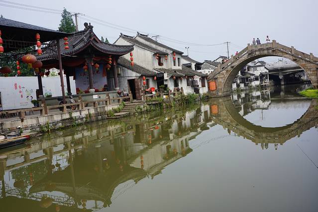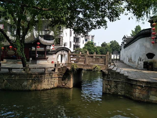 枫泾古镇从这个大门口进去是要门票的,里面有几个收费参观点。要去免费古镇可从旁边的马路走到后边的街道上,约5分钟就会看到一条河流,顺着小河旁边的长廊一直走,就可以看到枫泾古镇的中心区,也是最美的区域——枫泾三桥。