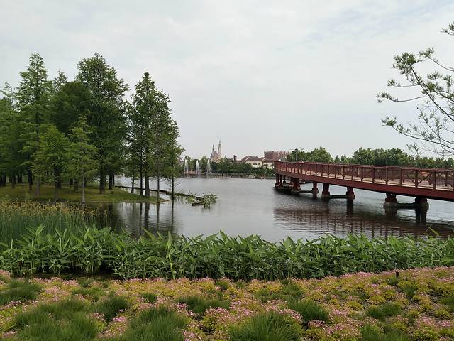 从迪士尼小镇湖畔走过一座横跨湖面的小桥,我们来到星愿公园,公园里非常幽静,漫步在湖边花丛中,从这里远眺迪士尼小镇,感觉小镇特别美。