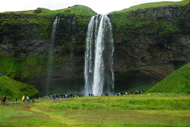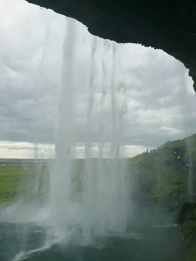 第四站:塞里雅兰瀑布(Seljalandsfoss),免门票。因附近有牧场也叫“牧羊瀑布”。最具特色是有一条小径环绕着瀑布,游人沿着小径行至山崖边,但见从天而降的瀑布犹如一道水帘挂在眼前,透过水帘看世界,别有一番朦胧迷离之美。