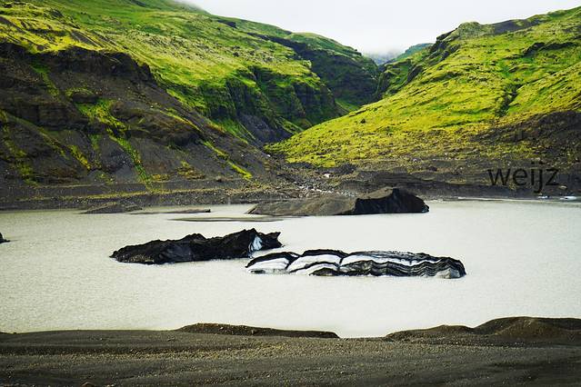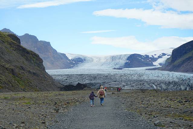 斯卡夫塔费德有9条徒步路线,我们选择了无需导游,无需付费,距离最短的S1徒步路线,这条路线只能走到冰川前,不能登上冰川。在8级大风中行走也是一次令人难忘的体验。拉紧防风帽,步履艰难地逆风走了二十来分钟,平时不大运动的我就有了打退堂鼓的心思。抬头看见前方一个6岁左右的小女孩跟着妈妈一起前行,便跟着她们一步一步跋涉到了冰川前的黑沙滩上。