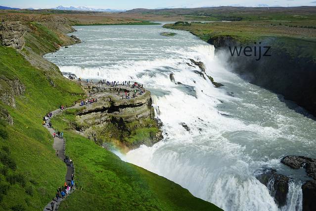 第三站:黄金瀑布(Gullfoss),免门票。冰岛最大的断层峡谷瀑布,也叫居德瀑布。百米余宽的河水分两级从高处飞流直下,再沿着大裂谷奔腾远去,蔚为壮观。