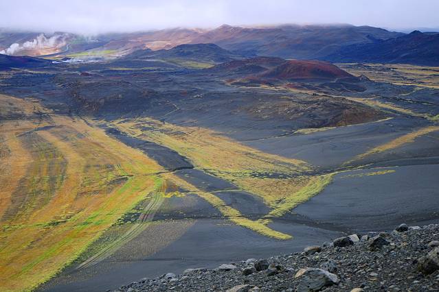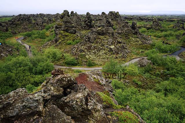 第一站:米湖(Myvatn),免门票。早上9点,驱车驶往米湖。一路上都是火山地理景观,越接近米湖,景色越荒凉。到达米湖景区后,从纳玛菲珈尔山脚到达米湖游客中心,沿途可见地热蒸腾,烟雾缭绕,黑砂石满山遍野,一片世界末日的荒芜。
