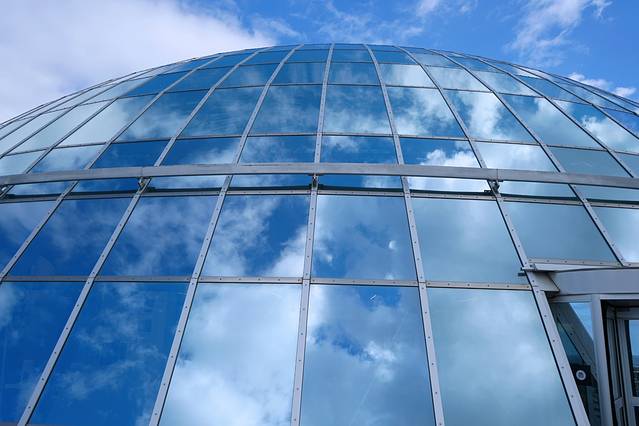 珍珠楼半圆形的玻璃穹顶由1176块玻璃格组成,在白云的映照下闪烁光芒。
