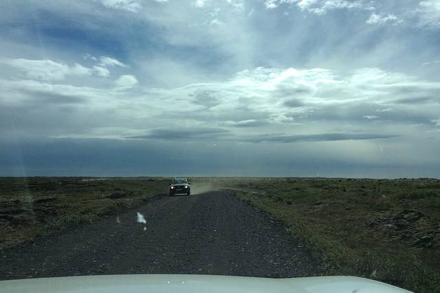 第二站:斯卡夫塔费德(Skaftafell),免门票。9点48分,我们离开黑沙滩驶往斯卡夫塔费德。斯卡夫塔费德是瓦特纳冰川国家公园的四大组成部分之一。瓦特纳冰川(Vatnajökull)是世界第三大冰川,面积达8450km²,厚度在几百米到2千米之间。约10点40分,汽车行至1号公路与204号公路交界处,遇交警拦车,通知前方封路,必须转204号公路绕行。204号公路的前半段为比较狭窄的黑砂石路面,汽车颠簸着驶过便扬起一片灰尘。