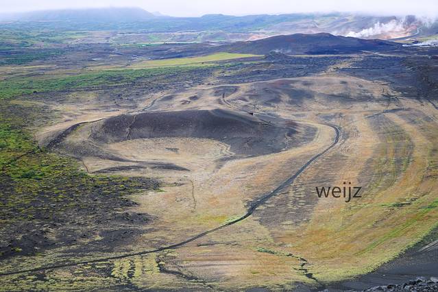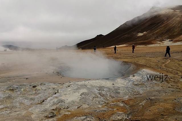 第二站:纳玛菲珈尔(Namafjall),免门票。我们的行驶路线从东向西,最先到达的就是位于米湖东面纳玛菲珈尔(Namafjall)地热区。这里地面上布满了或大或小的地热水坑,热气蒸腾,泥浆翻滚,空气中弥漫着如臭鸡蛋般的硫磺气味。使这一带弥漫着黄色的烟雾。