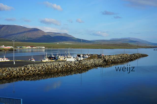约19点顺利到达斯卡加斯特伦的萨瑟斯旅馆。斯卡加斯特伦小镇位于在冰岛西北部,坐落在Húnaflói海湾的东岸,有着繁荣的渔港。小镇已有400多年的历史,常住人口仅500左右。这里并非旅游热地,游人寥寥。湛蓝的天空,湛蓝的海面,远山,夕阳,海湾,古老的灯塔,岁月静好。
