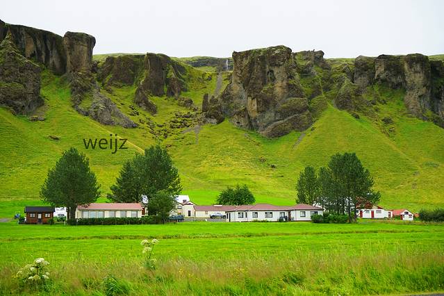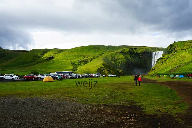 第五站:斯科加瀑布(Skógafoss),免门票。源于2010年曾经喷发火山的艾亚冰川,也被称作“森林瀑布”或“树林瀑布”。 斯科加瀑布两旁的山坡布满绿色的植被, 洁白的冰川水从绿色的山崖中倾泻而下,美不胜收。