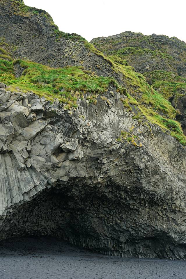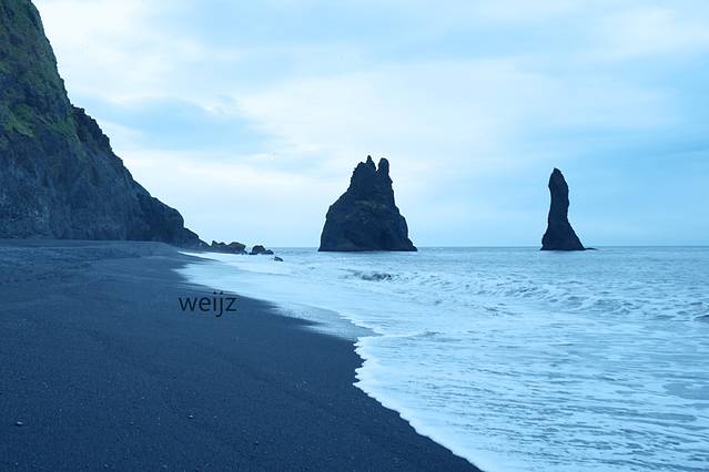 站在黑沙滩上,面对北大西洋,转左,雷尼斯德兰格(Reynisdrangar)扑入眼帘,这黑色玄武岩柱群傲然耸立在海水中,与岸边的山体遥相呼应,令人久久驻足,不忍离去。
