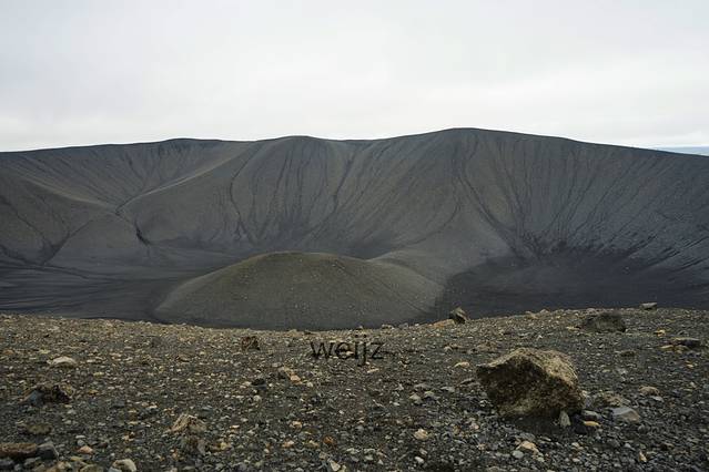 第三站:哈法尔火山(Hverfjall),免门票。从米湖游客中心出发,不到10分钟就到达了哈法尔火山脚的免费停车场。站在山下看,这座2500 年前喷发后留下的火山是一个长方形的平顶山。登上山顶,可见一个巨大的火山口,寸草不生,漆黑一片。站在山顶,可以眺望米湖全景。