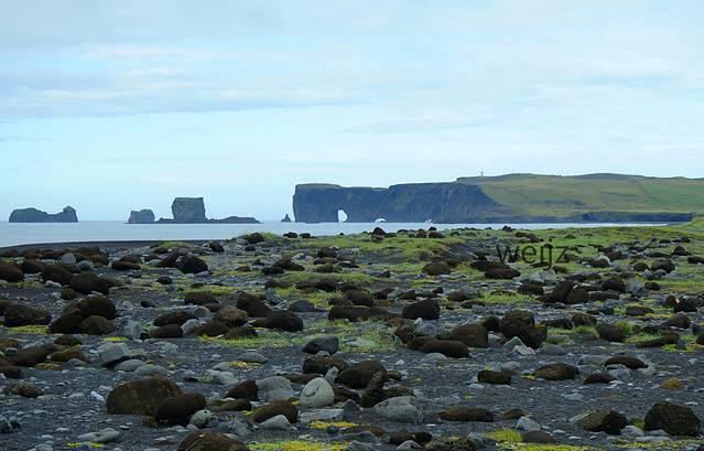 站在黑沙滩上,面对北大西洋,转右,迪霍拉里海岬尽收眼底,这块拱桥状的黑色熔岩巨石延伸入海120米,蔚为壮观。