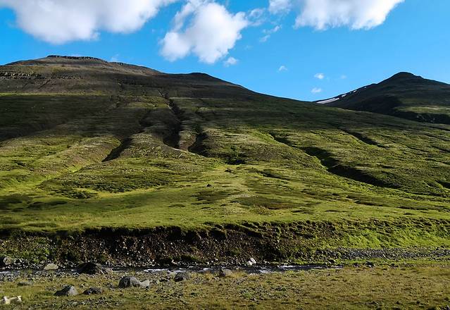 从北部的胡萨维克到西部的斯卡加斯特伦,有两处可以顺路观赏的景点,一是众神瀑布,二是冰岛的第二大城市阿克雷里。临行前,大家商量了一下,觉得有点观瀑疲劳(昨天观看黛提瀑布,一路满满艰辛,而黛提瀑布那世纪前般荒芜粗粝面容,也不完全符合大家的审美想象和审美预期,这或许是导致观瀑疲劳的原因之一),决定不再移车众神瀑布,至于阿克雷里,1号公路从城中穿过,我们就选择车游,也不再停留。 15点40分,我们离开美丽宜人的胡萨维克,出发前往今晚的居住地——斯卡加斯特伦。穿平原,绕海湾,过城镇,翻山越岭,一路风光绮丽。